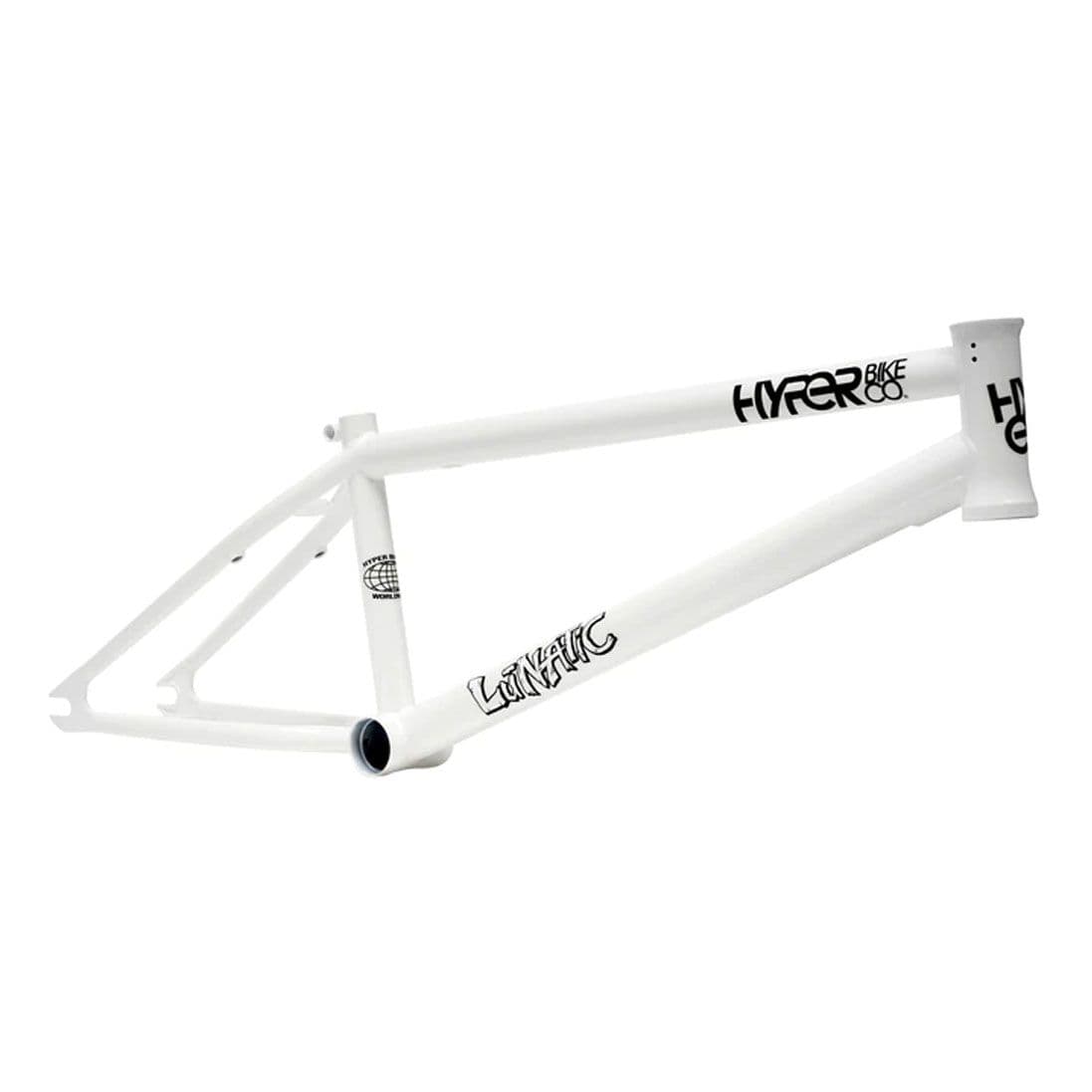 The 20.8" Hyper Lunatic is Brandon Loupos’s signature frame made from 4130 super thermo butted chromoly tubing featuring an integrated headtube, drilled gyro tabs, top tube and downtube gussets for strength, Mid BB shell, integrated seat-post clamp, removable U-brake mounts, Hyper logo seat-stay bridge, and 5mm thick heat-treated investment cast dropouts.
